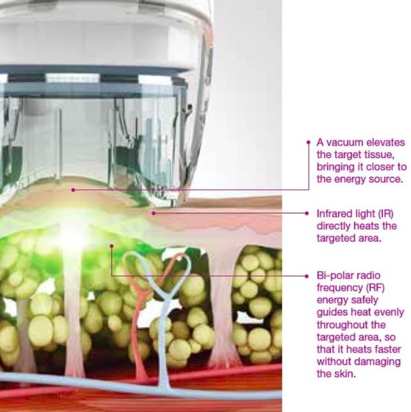 The device combines bipolar radiofrequency (RF) energy, infrared light, vacuum suction, and mechanical massage. The controlled heat stimulates collagen remodeling while the vacuum and rollers enhance circulation and lymphatic drainage, helping smooth and firm the treated area.